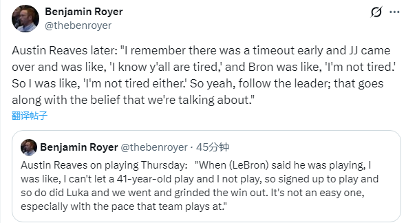 谈到赛前决定出战,里夫斯暗示:当勒布朗说他要打的技能,(我想)我不成在一个41岁的球员出战的情况下缺阵。是以我报名参赛,卢卡也报名参赛,咱们一齐拼尽全力赢下了比赛。这并退却易,尤其是计划到那支球队(热火)的比赛节律(很快)。