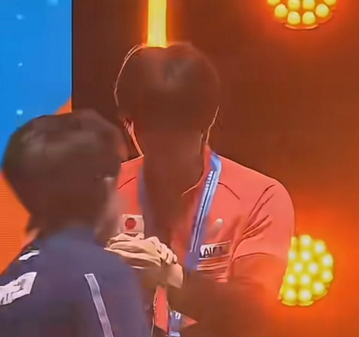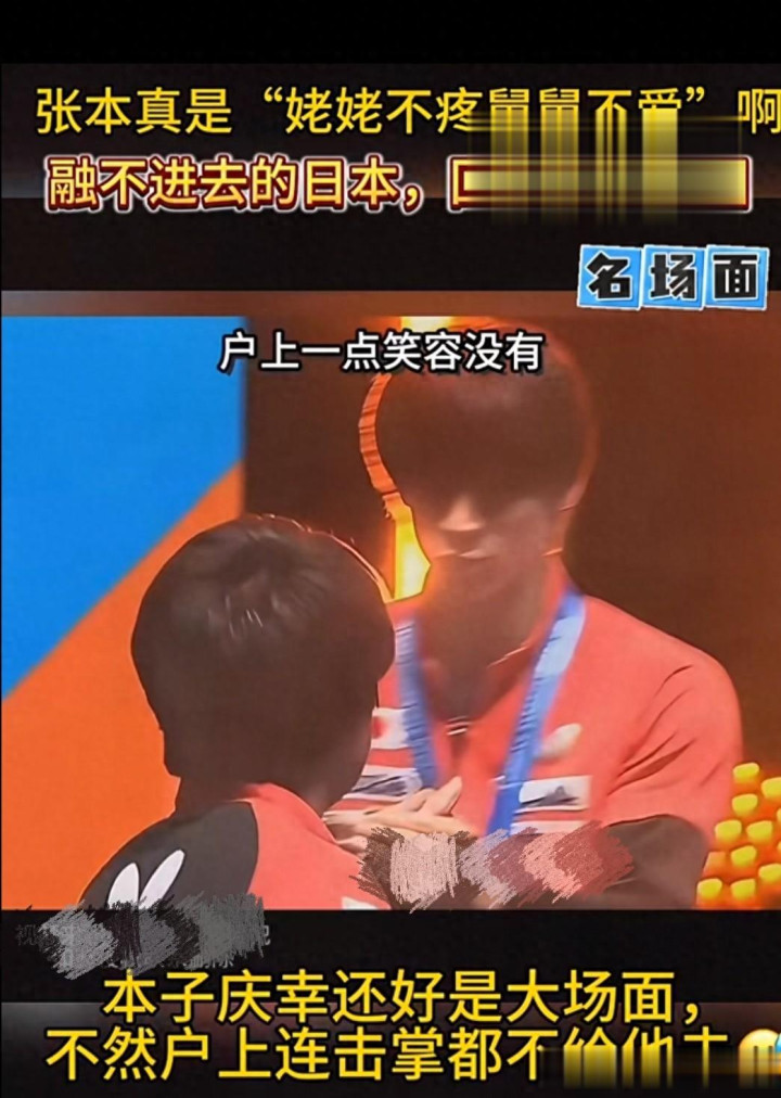 张本和户上击掌的技术,户上头无色彩,和楚钦击掌的技术却满脸笑貌。