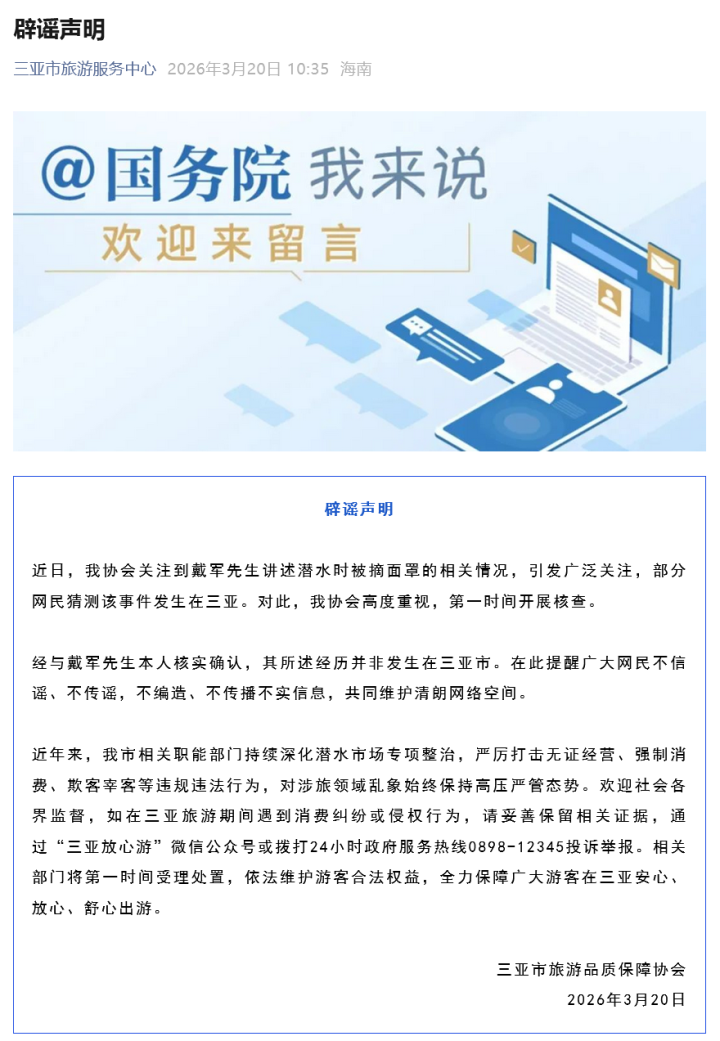近日,我协会温雅到戴军先生评释潜水时被摘面罩的关系情况,激发鄙俚温雅,部分网民意想该事件发生在三亚。对此,我协会高度醉心,第一时候开展核查。经与戴军先生本东谈主核实阐发,其所述阅历并非发生在三亚市。在此教导宏大网民不信谣、不传谣,不虚拟、不传播虚假信息,共同赞誉清明聚集空间。