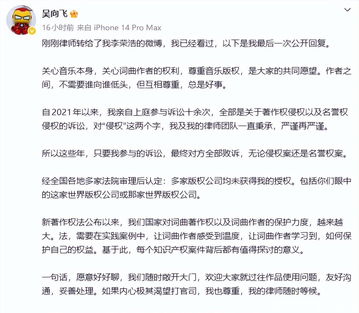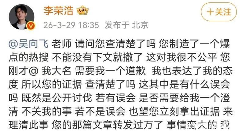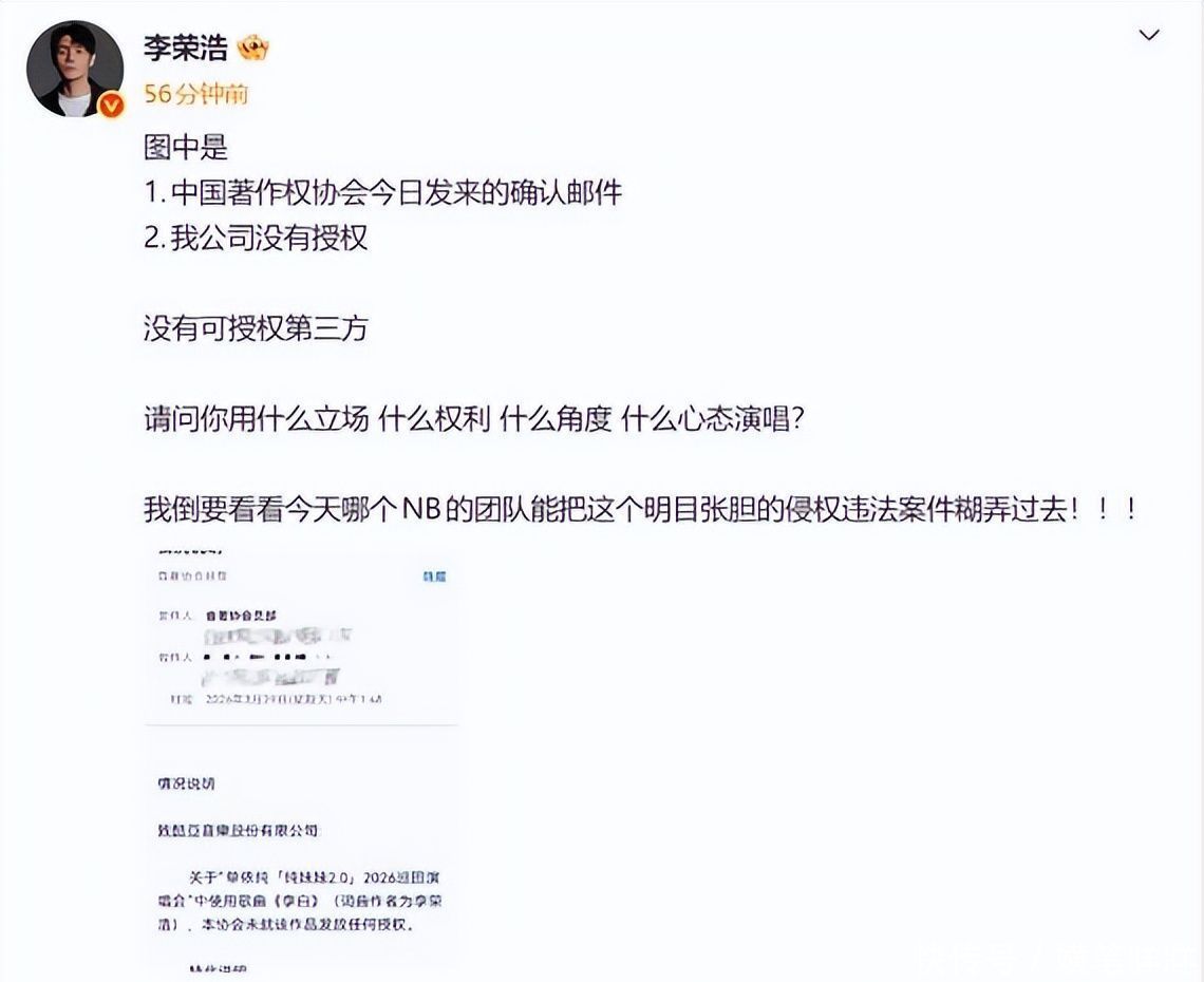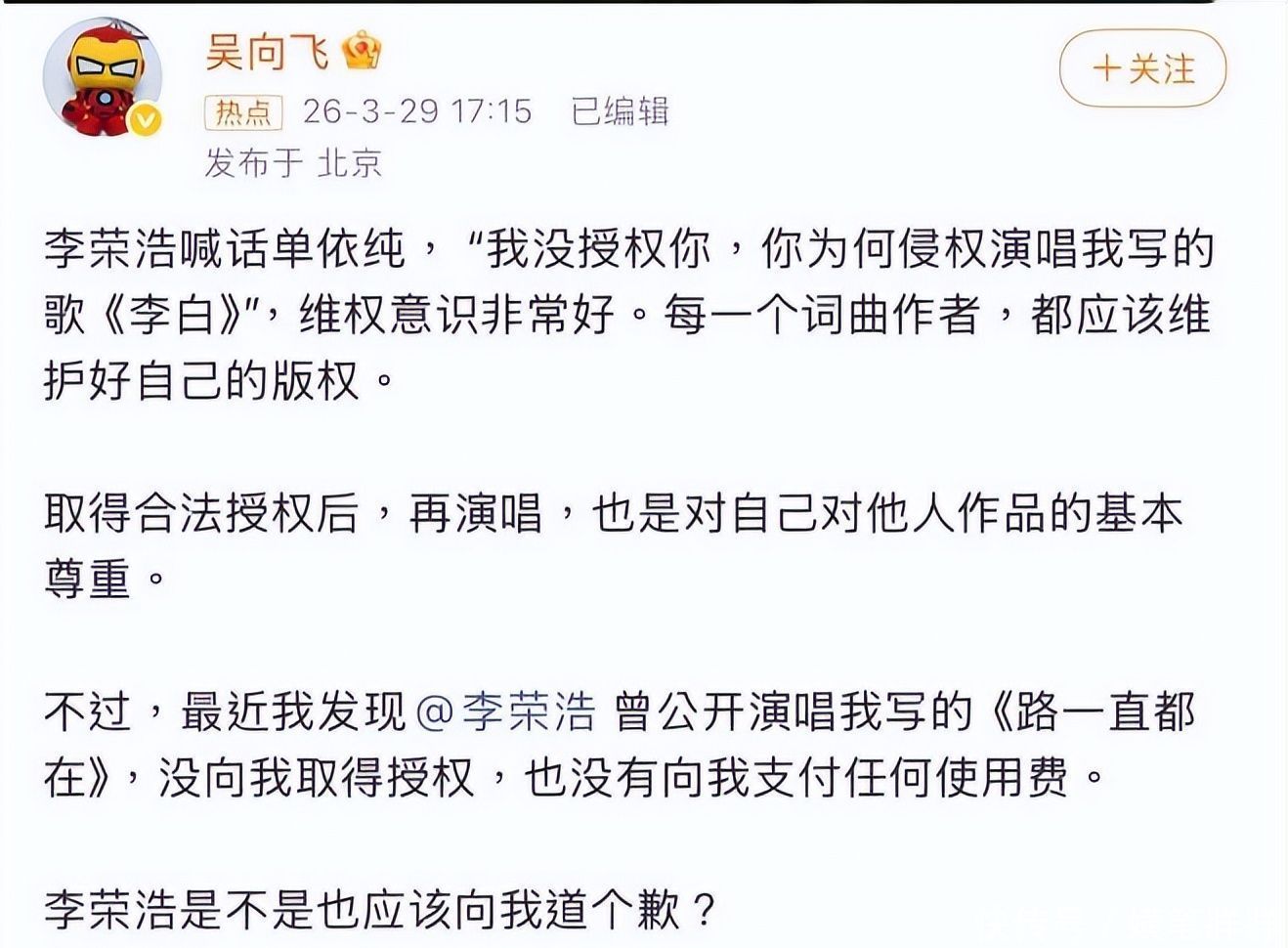 目击李荣浩维权话题冲上微博热搜榜首,吴向飞当晚即发布长微博,称李荣浩曾在某场上演中未经授权演唱《路一直都在》,要求其公开致歉,并配发数张迂缓截图佐证,意图借重完成个东说念主“版权卫士”东说念主设的终极加冕。