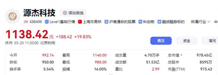 收尾3月20日午间收盘,源杰科技报1138.42元/股,涨19.83%,总市值978.45亿元。