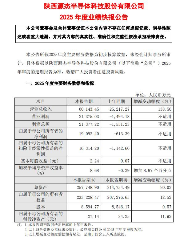 而就在2月底,源杰科技发布事迹快报,2025年瞻望收尾贸易收入6.01亿元,同比增长138.50%;瞻望收尾利润总和东说念主民币2.14亿元;瞻望收尾归母净利润1.91亿元,较2024年损失613万元的规模,相配于增长了超32倍。