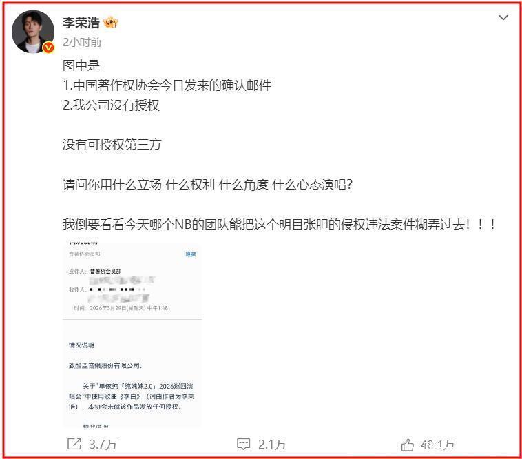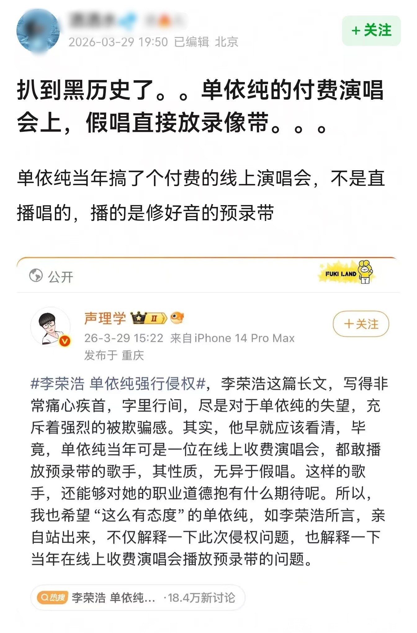 重生代歌手单依纯触碰了老牌歌手李荣浩的底线,十分震怒的李荣浩发文控诉。