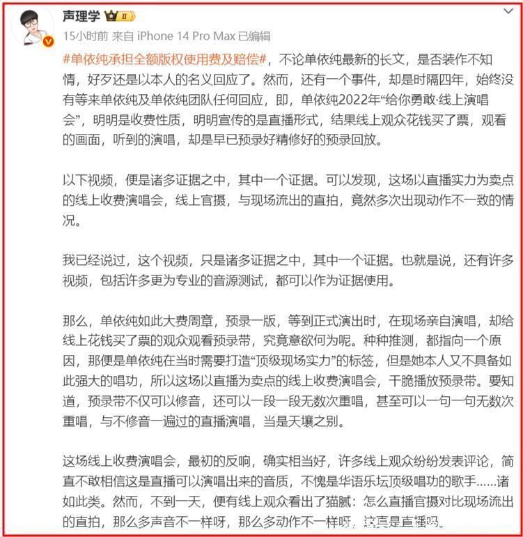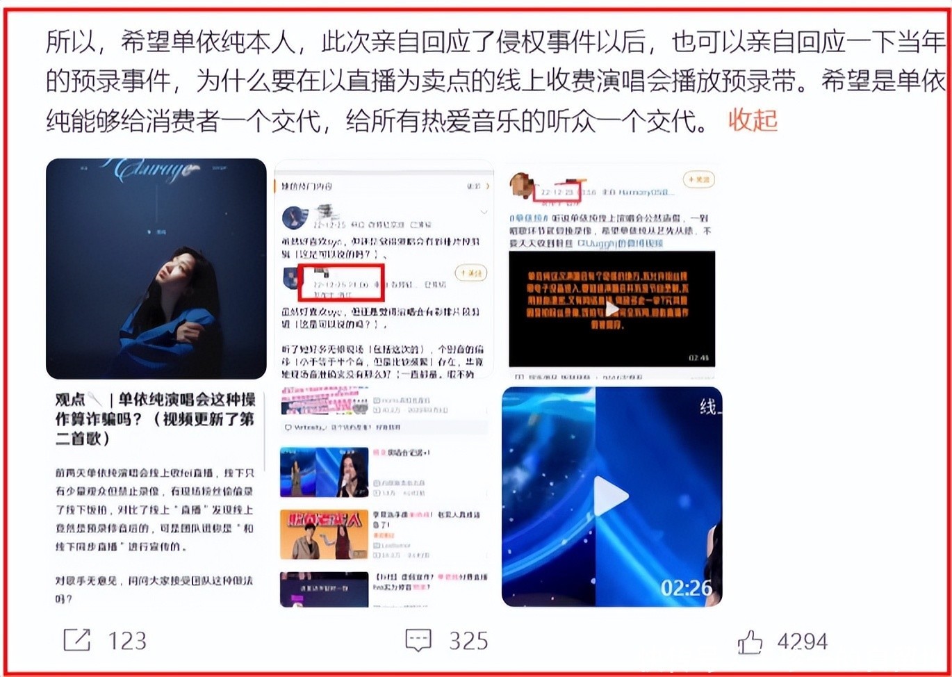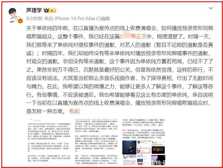 如今单依纯出现侵权事件,“声理学”重提此事,认为她播放预录带的行为与商演假唱无异,但愿她回复此事,给破钞者和喜爱音乐的听众一个嘱咐。