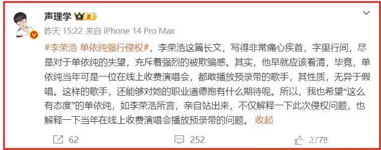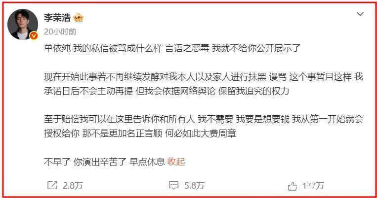 在控诉长文中,李荣浩也标明了我方对单依纯气派的变化。