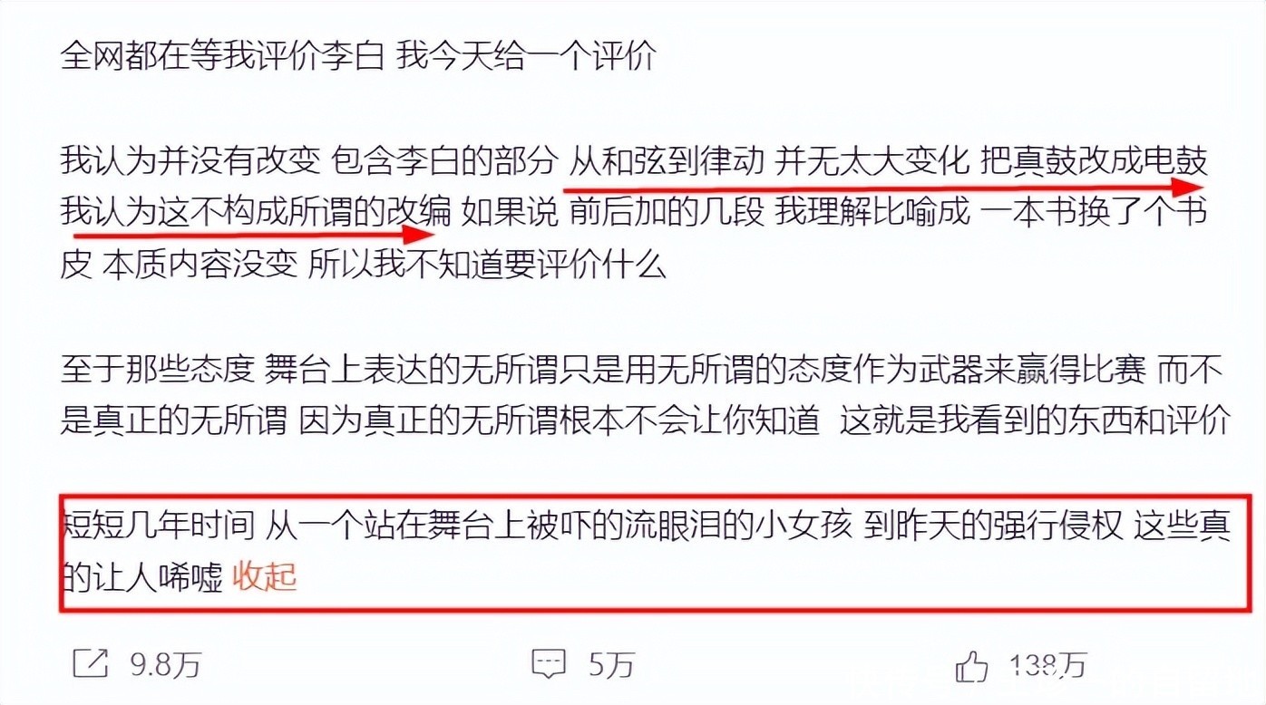 关于单依纯改编版的《李白》,李荣浩也初度进行了评价。他认为从和弦到律动,没什么大的变化,把真饱读改成电饱读,在原词前后加了几段,也没什么骨子转换,他说单依纯的操作构不成所谓的改编,仅仅像给一册书换了一个书皮。