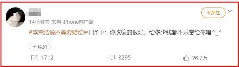 关于李荣浩的回复,网友对他的话进行了中译中,直言他想对单依纯说的是“你改编的很烂,给若干钱齐不乐意给你唱。”