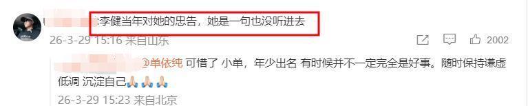 还有东说念主提到当年李健对她的忠告,让她要不务空名,不要健忘初心。网友咨嗟地说李健的话单依纯一句莫得听进去。