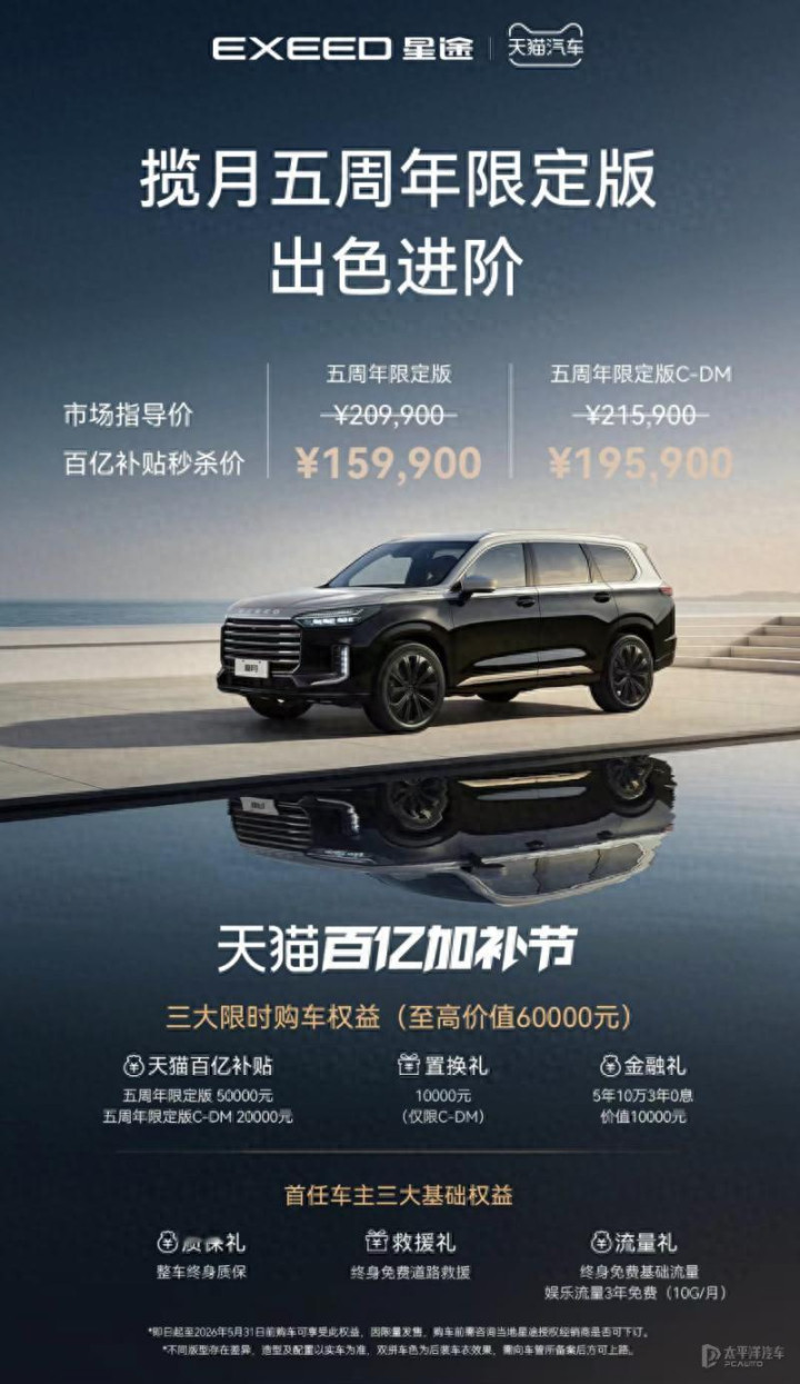 【太平洋汽车 新车频谈】4月1日,从奇瑞星途官方获悉,星途揽月五周年达成版上市,新车共推出2款车型,官方不异价区间为20.99-21.59万元,限时百亿补贴价为15.99-19.59万元。新车定位中大型SUV,提供2.0T+8AT能源组合和1.5T插混双电机系统可选,均配备四驱系统。