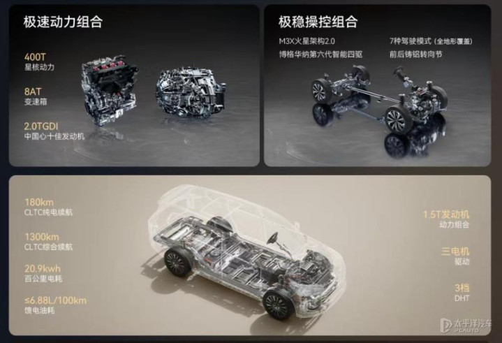星途揽月(询底价|查参配)搭载2.0T发动机,最大功率192千瓦,峰值扭矩400牛·米,匹配8AT变速箱,最高车速195km/h;星途揽月C-DM搭载1.5T双电机插混系统,空洞扭矩920牛·米,匹配3档DHT变速箱,零百加快5秒,CLTC纯电续航180km,空洞续航里程超1300km;